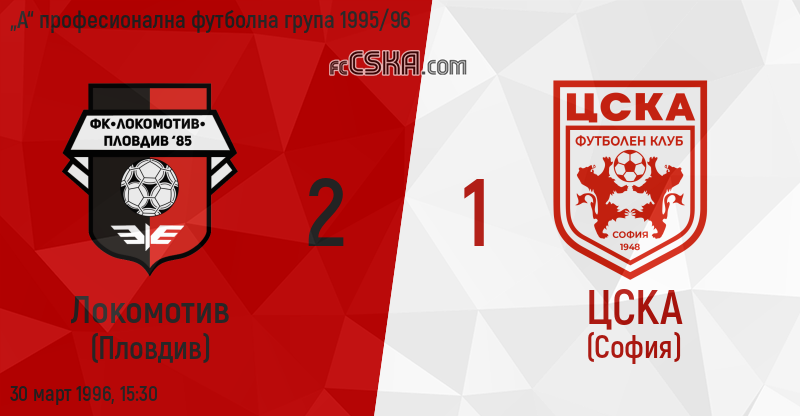 ЦСКА загуби от Локомотив (Пловдив) с резултат 2:1 във футболна среща от 23-ти кръг на „А“ професионална футболна група 1995/96 играна на 30 март 1996 г. в 15:30 ч. на стадион „Локомотив“ в/във Пловдив. Голмайстор за Армейците е Георги К. Георгиев (13′).