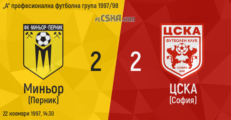 ЦСКА завърши наравно с Миньор (Перник) с резултат 2:2 във футболна среща от 15-и кръг на „А“ професионална футболна група 1997/98 играна на 22 ноември 1997 г. в 14:30 ч. на стадион „Миньор“ в/във Перник. Голмайстори за Армейците са Бончо Генчев (47′) и Иво Славчев (49′).