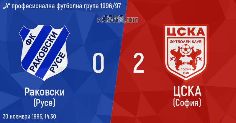 ЦСКА​ победи Раковски (Русе) с резултат 0:2 във футболна среща от 14-и кръг на „А“ професионална футболна група 1996/97 играна на 30 ноември 1996 г. в 14:30 ч. на стадион „Градски“ в/във Русе. Голмайстори за Армейците са Петър Жабов (3′) и Иво Славчев (82′).