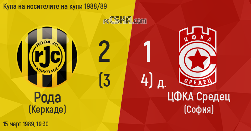 ЦФКА „Средец“ загуби от Рода (Керкаде) с резултат 2:1 във футболна среща от Четвъртфинал — реванш на Купа на носителите на купи 1988/89 играна на 15 март 1989 г. в 19:30 ч. на стадион „Спортпарк Калхейде“ в/във Керкраде. Голмайстори за Армейците са Христо Стоичков (78′ и 121′ от дузпа), Георги К. Георгиев (121′ от дузпа), Трифон Иванов (121′ от дузпа) и Недялко Младенов (121′ от дузпа).