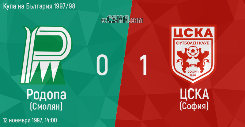 ЦСКА победи Родопа (Смолян) с резултат 0:1 във футболна среща от 1/16 финал на Купа на България 1997/98 играна на 12 ноември 1997 г. в 14:00 ч. на стадион „Септември“ в/във Смолян. Голмайстор за Армейците е Ивайло Андонов (65′).