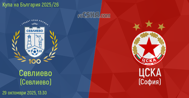 ЦСКА​ ще играе с/със Севлиево във футболна среща от 1/16 финал — първи кръг на Купа на България 2025/26 на 29 октомври 2025 г. в 13:30 ч. на стадион „Раковски“ в/във Севлиево. Мачът ще бъде предаван на живо по „Диема спорт”.