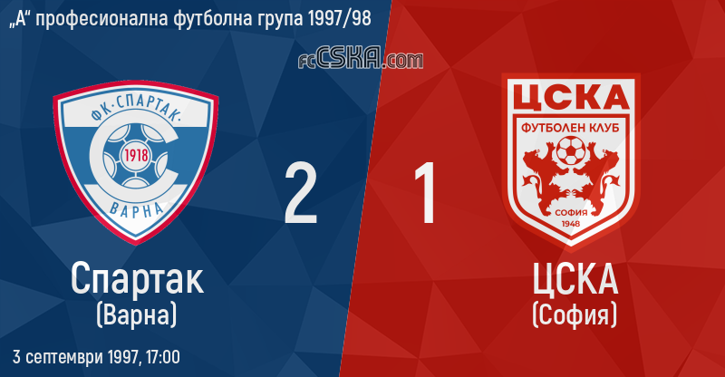 ЦСКА загуби от Спартак (Варна) с резултат 2:1 във футболна среща от 5-и кръг на „А“ професионална футболна група 1997/98 играна на 3 септември 1997 г. в 17:00 ч. на стадион „Спартак“ в/във Варна. Голмайстор за Армейците е Петър Жабов (69′).