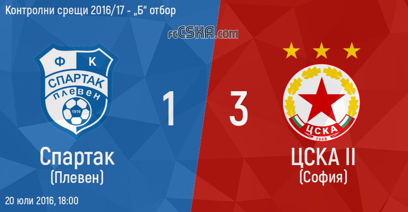 ЦСКА II победи Спартак (Плевен) с резултат 1:3 във футболна среща от Контролни срещи 2016/17 - „Б“ отбор играна на 20 юли 2016 г. в 18:00 ч. на стадион „Градски“ в/във Ловеч.