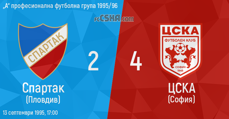 ЦСКА победи Спартак (Пловдив) с резултат 2:4 във футболна среща от 2-ри кръг на „А“ професионална футболна група 1995/96 играна на 13 септември 1995 г. в 17:00 ч. на стадион „Пловдив“ в/във Пловдив. Голмайстори за Армейците са Георги Донков (6′), Милен Петков (35′), Петър Жабов (65′) и Анатоли Нанков (83′).