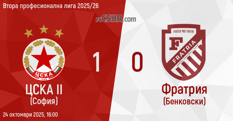 ЦСКА II победи Фратрия (Бенковски) с резултат 1:0 във футболна среща от 13-и кръг на Втора професионална лига 2025/26 играна на 24 октомври 2025 г. в 16:00 ч. на стадион „Драгалевци“ в/във София.