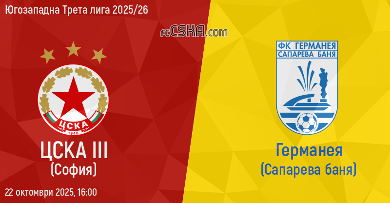 ЦСКА III ще играе с/със Германея във футболна среща от 12-и кръг на Югозападна Трета лига 2025/26 на 22 октомври 2025 г. в 16:00 ч. на стадион „Бенковски“ в/във Костенец.