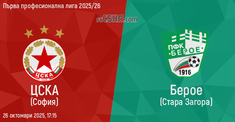 ЦСКА​ ще играе с/със Берое във футболна среща от 13-и кръг на Първа професионална лига 2025/26 на 26 октомври 2025 г. в 17:15 ч. на стадион „Васил Левски“ в/във София. Мачът ще бъде предаван на живо по „Диема спорт”.