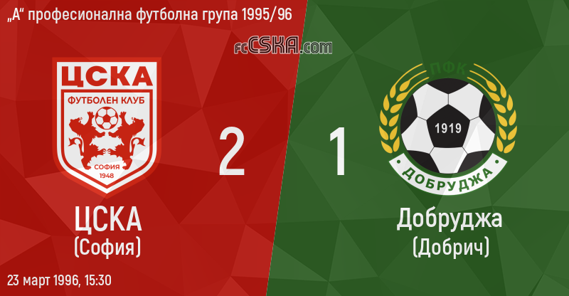 ЦСКА победи Добруджа (Добрич) с резултат 2:1 във футболна среща от 22-ри кръг на „А“ професионална футболна група 1995/96 играна на 23 март 1996 г. в 15:30 ч. на стадион „Българска армия“ в/във София. Голмайстори за Армейците са Георги Донков (28′ от дузпа) и Петър Михтарски (33′).