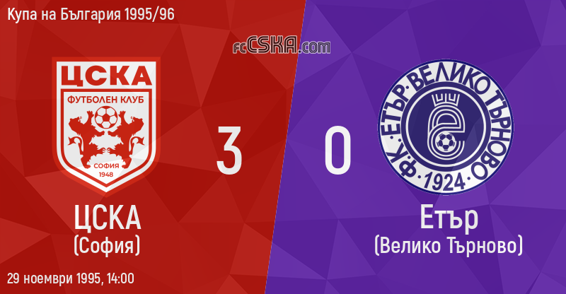 ЦСКА победи Етър (Велико Търново) с резултат 3:0 във футболна среща от Осминафинал — първа среща на Купа на България 1995/96 играна на 29 ноември 1995 г. в 14:00 ч. на стадион „Българска армия“ в/във София. Голмайстори за Армейците са Петър Жабов (23′), Бойко Величков (79′ от дузпа) и Милен Петков (81′).