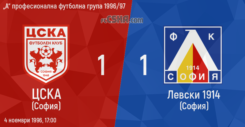 ЦСКА​ завърши наравно с Левски 1914 (София) с резултат 1:1 във футболна среща от 11-и кръг на „А“ професионална футболна група 1996/97 играна на 4 ноември 1996 г. в 17:00 ч. на стадион „Васил Левски“ в/във София. Голмайстор за Армейците е Димитър Иванов (45′).