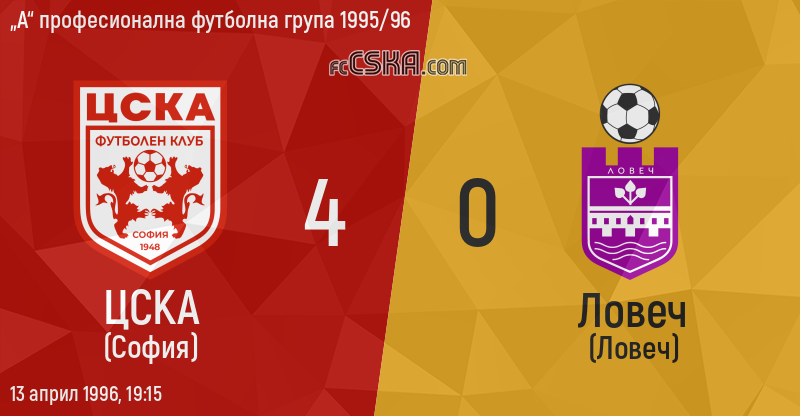 ЦСКА победи Ловеч (Ловеч) с резултат 4:0 във футболна среща от 26-и кръг на „А“ професионална футболна група 1995/96 играна на 13 април 1996 г. в 19:15 ч. на стадион „Българска армия“ в/във София. Голмайстори за Армейците са Петър Жабов (31′ и 71′), Румен Христов (41′) и Георги Чакъров (88′).