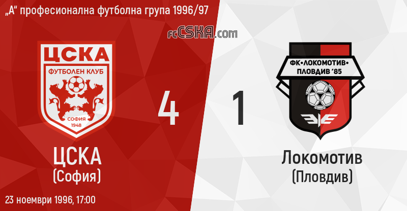 ЦСКА победи Локомотив (Пловдив) с резултат 4:1 във футболна среща от 13-и кръг на „А“ професионална футболна група 1996/97 играна на 23 ноември 1996 г. в 17:00 ч. на стадион „Българска армия“ в/във София. Голмайстори за Армейците са Петър Жабов (18′), Ивайло Андонов (31′), Добромир Митов (66′) и Милен Петков (87′).