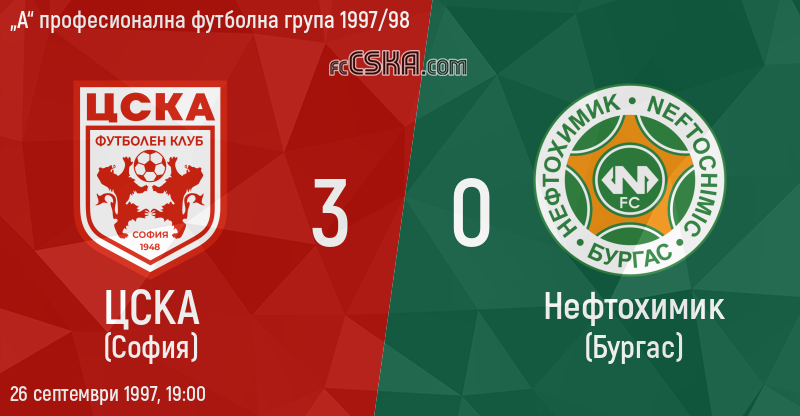 ЦСКА победи Нефтохимик (Бургас) с резултат 3:0 във футболна среща от 8-и кръг на „А“ професионална футболна група 1997/98 играна на 26 септември 1997 г. в 19:00 ч. на стадион „Българска армия“ в/във София. Голмайстори за Армейците са Адалберт Зафиров (53′), Божидар Джуркович (67′) и Иво Славчев (83′).