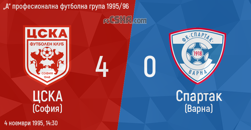 ЦСКА победи Спартак (Варна) с резултат 4:0 във футболна среща от 12-и кръг на „А“ професионална футболна група 1995/96 играна на 4 ноември 1995 г. в 14:30 ч. на стадион „Българска армия“ в/във София. Голмайстори за Армейците са Румен Христов (62′ и 70′) и Георги К. Георгиев (90′). Автогол за гостите си вкара Сергей Димитров (15′).