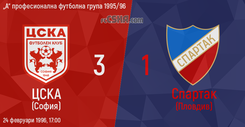 ЦСКА победи Спартак (Пловдив) с резултат 3:1 във футболна среща от 17-и кръг на „А“ професионална футболна група 1995/96 играна на 24 февруари 1996 г. в 17:00 ч. на стадион „Българска армия“ в/във София. Голмайстори за Армейците са Петър Михтарски (47′ и 87′) и Георги К. Георгиев (68′ от дузпа).