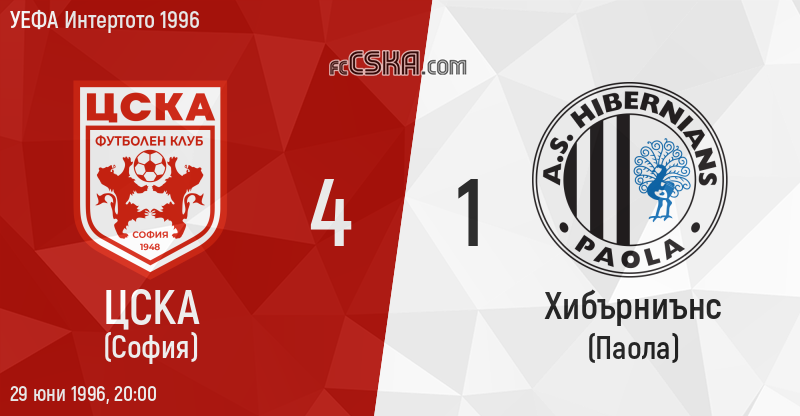 ЦСКА победи Хибърниънс (Паола) с резултат 4:1 във футболна среща от Група 11 — втори кръг на УЕФА Интертото 1996 играна на 29 юни 1996 г. в 20:00 ч. на стадион „Българска армия“ в/във София. Голмайстори за Армейците са Илия Войнов (37′ от дузпа), Методи Деянов (60′), Костадин Видолов (62′) и Петър Жабов (67′).