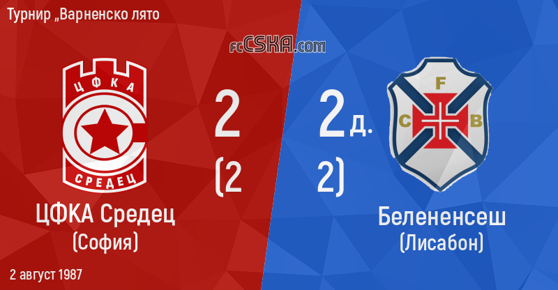 ЦФКА „Средец“ завърши наравно с Белененсеш (Лисабон) с резултат 2:2 във футболна среща от Мач за трето място на Турнир „Варненско лято играна на 2 август 1987 г. на стадион „Юрий Гагарин“ в/във Варна. Голмайстори за Армейците са Христо Стоичков (45′ от дузпа) и Емил Костадинов (48′).